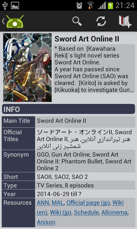 用于搜索和咨询所有动画电视连续剧和电影的Android应用程序可从Anidb.net提供咨询系列的历史记录,可让您为易于访问的系列添加书签,具有可自定义的高速缓存选项和一个部分,可搜索与所选系列相关的所有产品搜索Amazon。